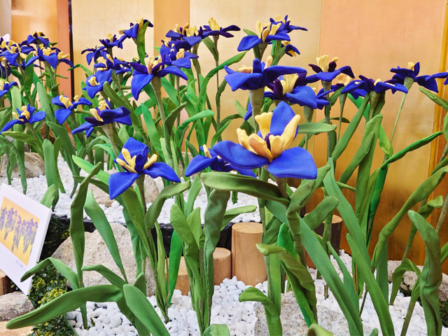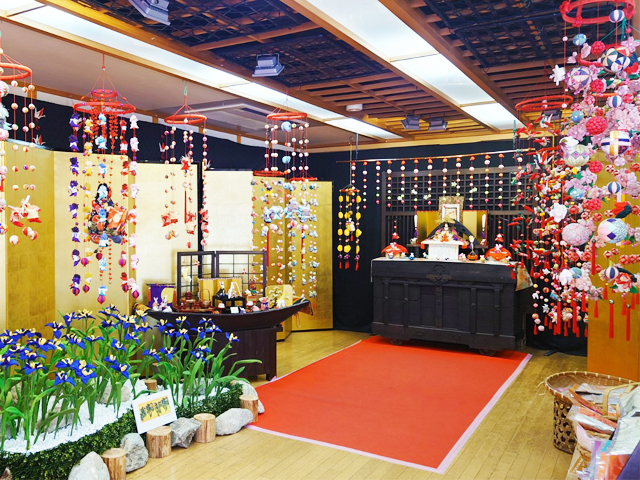 会場には藤やかきつばた、たくさんのつるし雛が美しいきぬ姫を囲むように展示されております。