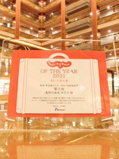 当館は「じゃらんアワード2021」において、「じゃらん OF THE YEAR 2021 売れた宿大賞」の関東甲信越101~300室部門で、第2位を受賞しました!