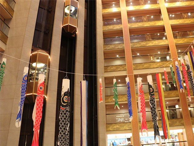 まず当館にご到着してご覧いただけるのは、ロビーに飾られている五月飾りと吹き抜けのこいのぼり!