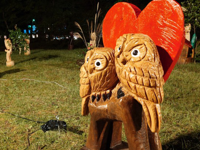 その先には鬼怒川温泉での思い出が描かれた絵手紙による行灯の「想い出回廊」、焼き物の街として有名な栃木県益子町から陶芸作家の方の作品が展示された「アートの森」、チェーンソーカービングによるふくろうたちが展示された「ふくろうの森」、地域の小学校・幼稚園・保育園の皆さまによる「みんなのあかり」、竹に装飾を施して灯りをともした「竹あかり」コーナーと続きます◎