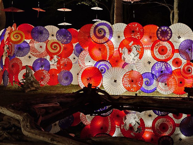 赤や紫、大小様々な和傘とそれらを照らすあかりで、幻想的な和の空間が広がります☆