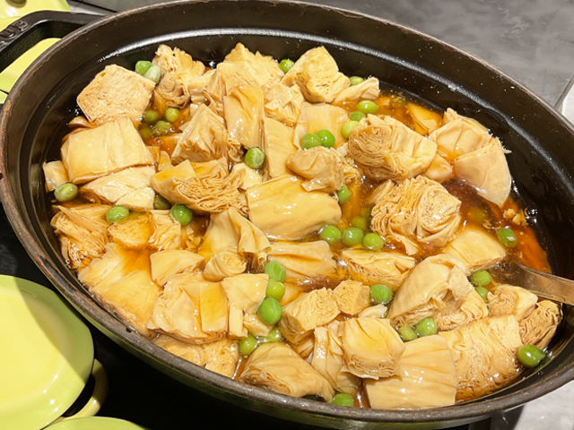 当館のブッフェでもこの「湯波」をお召し上がりいただくことができ、「生湯波」としてそのままお召し上がりいただける他、煮物の「たぐり湯波」、天ぷらの「湯波」、鍋やパスタの具材としてもご用意しております☆彡