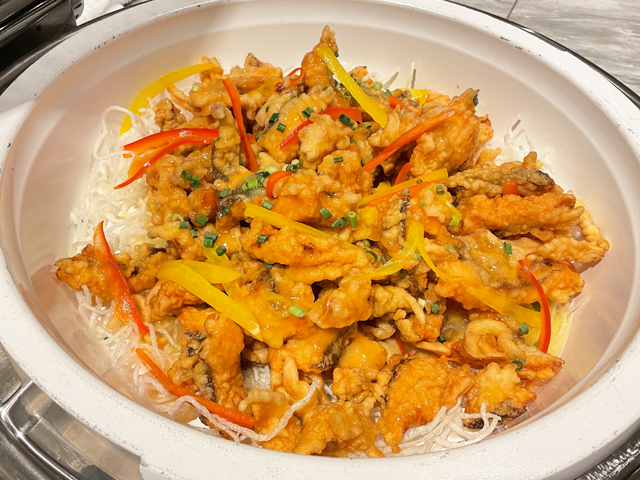 当館のブッフェでは、「ヤシオマス」を揚げてあんかけと絡めてご用意しております(^^)