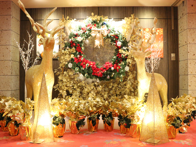 秀峰館6階 ティーラウンジ「水季」前には大きなゴールドのトナカイの飾りがございます!