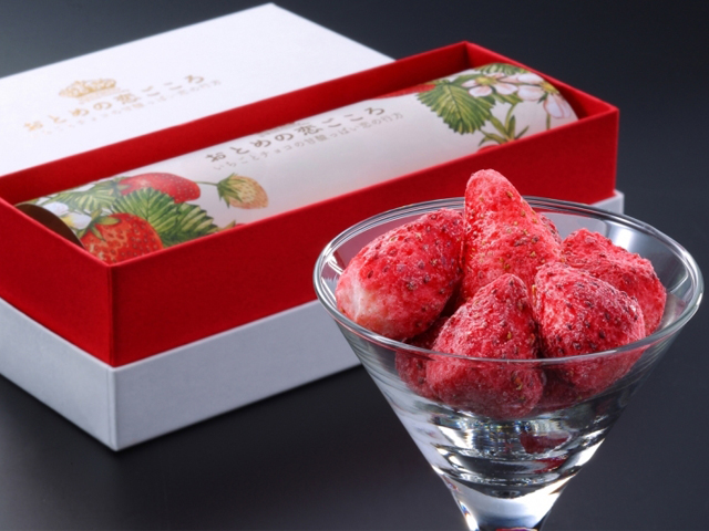 フリーズドライ加工した栃木県産のとちおとめに、独自の製法でホワイトチョコレートを果実の中心部までしみ込ませたあさやオリジナルのチョコレート菓子です♪