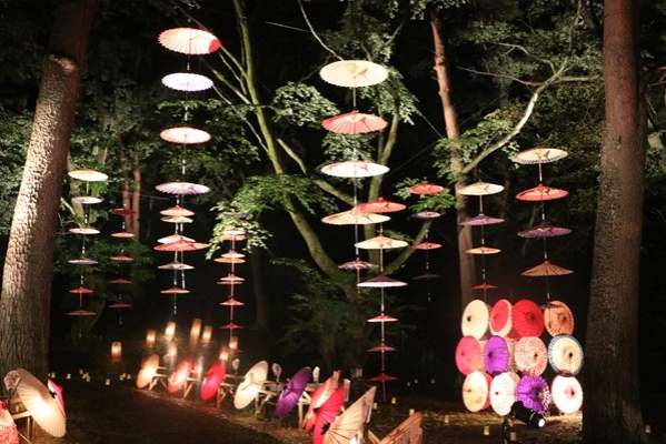 和傘を使った「和傘華浪漫」の装飾は、大きな木々が立ち並ぶ大自然の中、色とりどりの和傘が華やかに彩ります(^^)