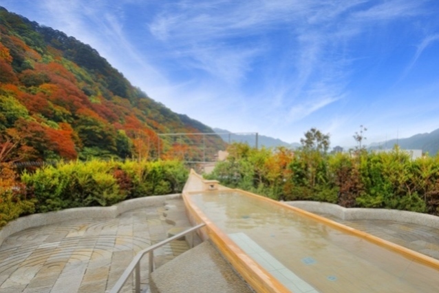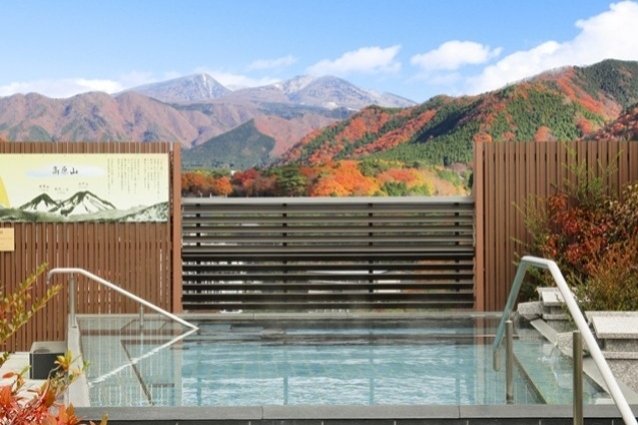 鬼怒川温泉の紅葉時期には、秀峰館13階 空中庭園露天風呂にて赤や黄色に色づく美しい鬼怒川温泉の山々をご覧いただけます◎
