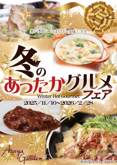 ブッフェレストラン「ASAYA GARDEN」では、現在「冬のあったかグルメフェア」を開催しております♪