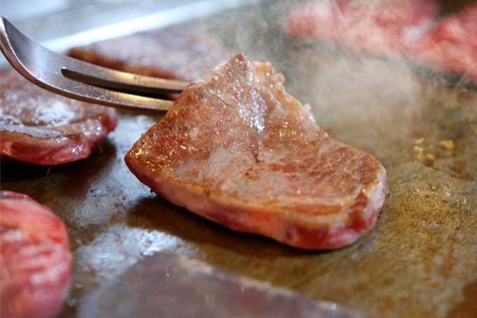 シェフが鉄板の上で丁寧に焼き上げるステーキは、香ばしい音、立ちのぼる香り、焼きたてのジューシーな味わいまで、まさに五感で楽しめる逸品!