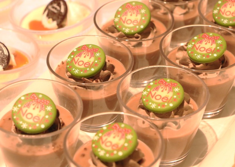 可愛いらしいクリスマスリースのイラストが描かれたチョコレートを乗せたチョコムースは、今だけの限定です♪