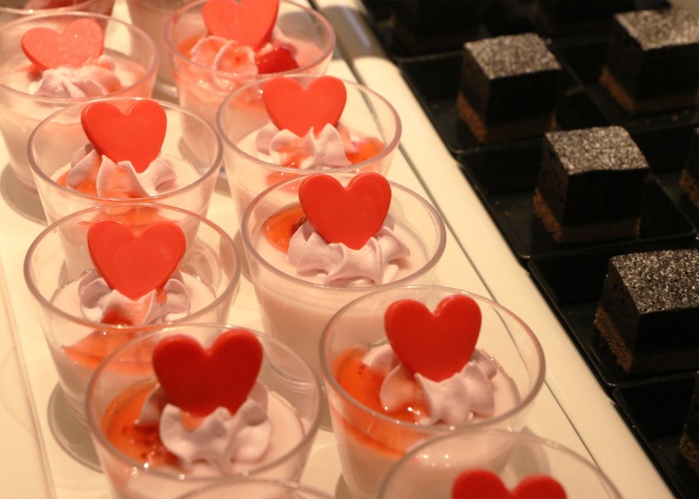 可愛らしいハート型のチョコレートをトッピングしたケーキやムースが並び、バレンタインらしい華やかさを添えています♪
