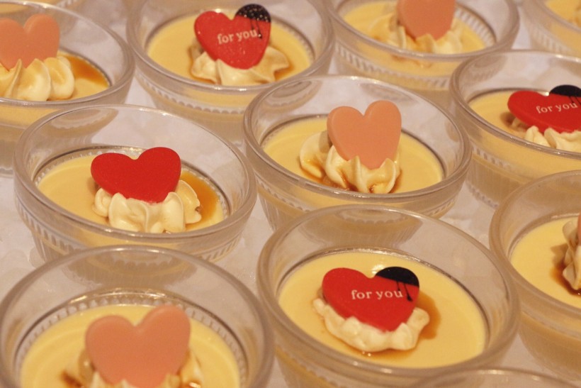 可愛らしいハート形のチョコレートがトッピングされたプリンやケーキ☆彡